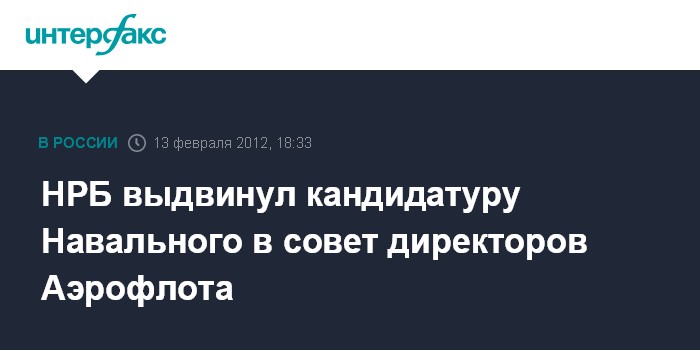 Москва. 13 февраля. INTERFAX.RU - Национальный резервный банк (НРБ) Александра Лебедева выдвинул Алексея Навального в качестве кандидата в совет директоров ОАО "Аэрофлот - Российские авиалинии", сообщили "Интерфаксу" в пресс-службе НРБ.