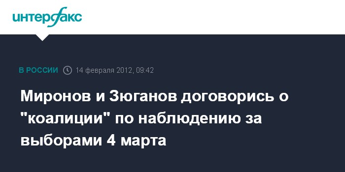 Москва. 14 февраля. INTERFAX.RU - К выборам президента России 4 марта будет сформирована коалиция наблюдателей от "Справедливой России" и компартии, сообщил в понедельник во время теледебатов на Первом канале со своим соперником от КПРФ Геннадием Зюгановым лидер "справедливоросов" Сергей Миронов.