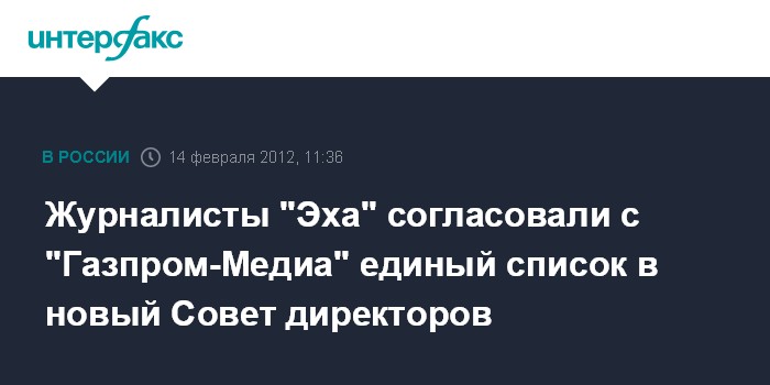 Москва. 14 февраля. INTERFAX.RU - Журналисты-акционеры радиостанции "Эхо Москвы" согласовали с контролирующим акционером "Газпром-медиа" единый список в новый состав совета директоров радиостанции, в котором сохранен институт независимых директоров, говорится в коммюнике "Эхо Москвы", поступившем во вторник в "Интерфакс".