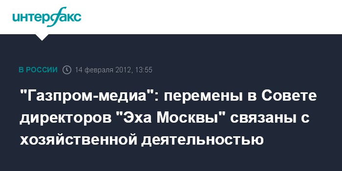 "Совет директоров - это орган хозяйственной деятельности предприятия. Во всех предприятиях в совет директоров входят бизнес-менеджеры - этот же стандарт мы хотим применить на "Эхе Москвы". Совет директоров не занимается редакционной политикой", - заявила во вторник "Интерфаксу" официальный представитель ОАО "Газпром-Медиа" Ирина Зенкова.