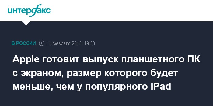Москва. 14 февраля. INTERFAX.RU - Американская Apple Inc. готовит выпуск планшетного ПК с экраном, размер которого будет меньше, чем у популярного iPad, пишет газета The Wall Street Journal со ссылкой на информированные источники.