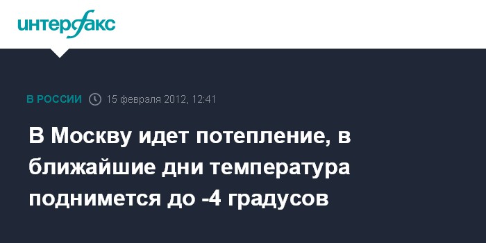 Москва. 15 февраля. INTERFAX.RU – Синоптики официально объявили о завершении морозов: среда станет самым теплым днем за последние три недели. "Минувшая ночь была самой теплой за последние 3 недели, и сегодняшний день – самый теплый за последний 3 недели. Температура после обеда повыситься до -2..4, что означает возвращение в норму", - сообщил "Интерфаксу" ведущий специалист центра прогнозов погоды "Фобос" Леонид Старков. "В перспективе погода не останется в рамках климатической нормы, температура опять понизится, вероятность снега уменьшится, хотя он еще возможен в предстоящие двое суток, но лишь местами и небольшой", - добавил он.