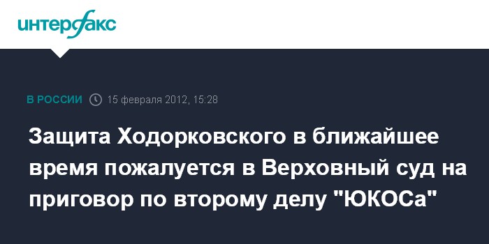 Петрозаводск/Сегежа. 15 февраля. INTERFAX.RU - Жалоба на второй приговор бывшему главе "ЮКОСа" Михаилу Ходорковскому будет подана в Верховный суд РФ в ближайшее время, сообщил адвокат Вадим Клювгант.