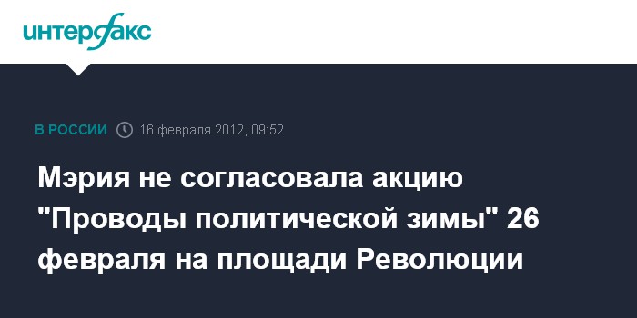 Москва. 16 февраля. INTERFAX.RU - Московские власти отказываются согласовать проведение акции "Проводы политической зимы", 26 февраля на площади Революции в центре столицы, сказано в заявлении члена Оргкомитета кампании "За честные выборы", координатора движения "Левый Фронт" Сергея Удальцова.