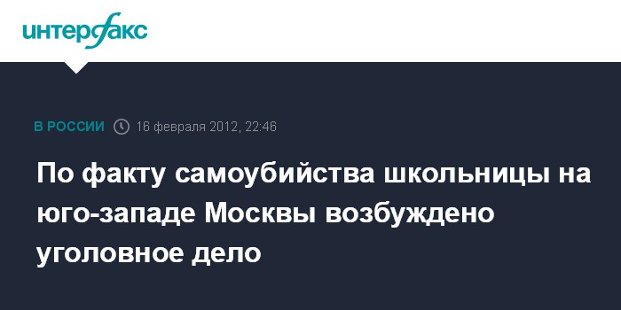 Москва. 16 февраля. INTERFAX.RU - По факту самоубийства школьницы на юго-западе столицы в четверг следственными органами Следственного комитета России по Москве возбуждено уголовное дело по признакам преступления, предусмотренного ст.110 УК РФ (доведение до самоубийства).