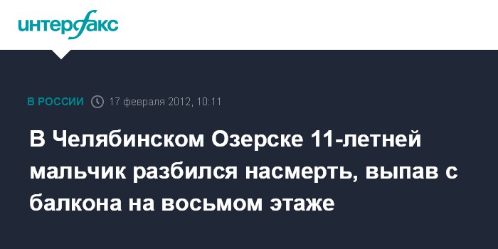 Челябинск. 17 февраля. INTERFAX.RU - Следователи города Озерск (Челябинская область) выясняют обстоятельства смерти 11-летнего мальчика, который погиб, упав с балкона, сообщил агентству "Интерфакс-Урал" руководитель следственного отдела города СУ СКР по региону Алексей Петров.