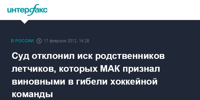 Суд отклонил иск родственников летчиков, которых МАК признал виновными в гибели хоккейной команды