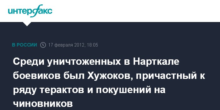По его данным, Т.Хужоков был причастен к ряду террористических преступлений, покушений на сотрудников правоохранительных органов и чиновников, в частности, к обстрелу 2 февраля главы Урванского района КБР Антимиркана Канокова, в результате которого погиб сопровождавший чиновника участковый местного РОВД.