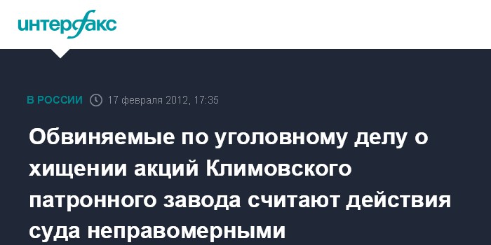 Москва. 17 февраля. INTERFAX.RU - Адвокат обвиняемых по уголовному делу о хищении акций ЗАО "Климовский специализированный патронный завод" считает, что его возбуждение было неправомерным.