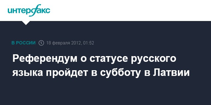 Рига. 18 февраля. ИНТЕРФАКС - В Латвии в субботу, 18 февраля, состоится референдум о внесении в Конституцию поправок, присваивающих русскому языку статус второго государственного.