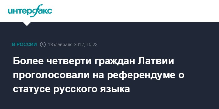 Рига. 18 февраля. INTERFAX.RU/BNS - По состоянию на 12 часов субботы, в референдуме о признании русского языка вторым государственным в Латвии приняли участие 414 тыс. 867 человек - около 27% от общего количества избирателей.