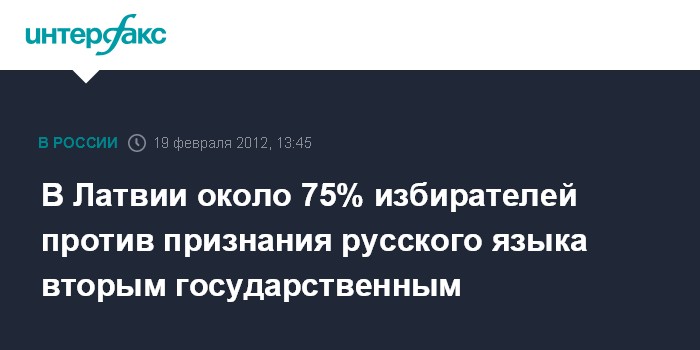 Рига. 19 февраля. INTERFAX.RU/BNS - В Латвии в субботу на референдуме за придание русскому языку статуса второго государственного проголосовали 24,88% граждан страны, против - 74,8%, сообщил ЦИК страны.