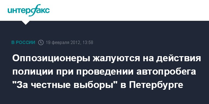 Санкт-Петербург. 19 февраля. INTERFAX.RU - Сотрудники петербургской полиции мешают проведению оппозиционного автопробега в центре города "За честные выборы", заявила Интерфаксу" исполнительный директор Объединенного гражданского фронта Ольга Курносова в воскресенье. "Они всячески пытаются помешать нам. Под разными предлогами останавливают машины, проверяют документы, пробивают по базам и не пускают", - утверждала О.Курносова.