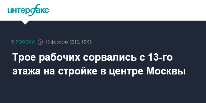 "В субботу рано утром на строительстве крупного медцентра на Новом Арбате произошел несчастный случай: стоявшая на 13 этаже приставная лестница внезапно упала, при этом сбросив вниз трех рабочих. Мужчины, пролетев несколько метров, упали на балкон 11 этажа. Все трое госпитализированы в тяжелом состоянии", - сказал собеседник агентства.