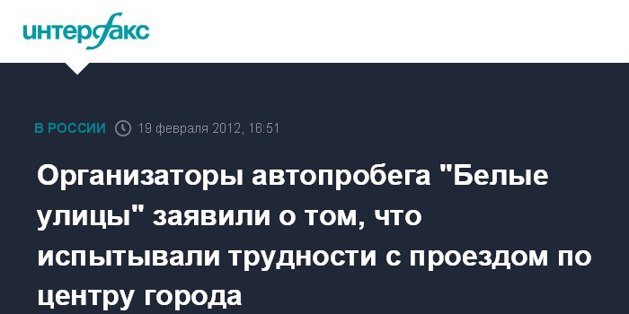 Москва. 19 февраля. INTERFAX.RU - Участники оппозиционного автопробега "Белые улицы" в Москве испытывают трудности с проездом по центру города из-за организованных ГИБДД ограничений и автомобилистов-провокаторов, утверждают в обществе "Синих ведерок". "Практически все повороты с Садового и Бульварного колец в сторону центра перекрыты, либо светофор включается на несколько секунд", - сообщил "Интерфаксу" координатор общества "Синих ведерок" (ОСВ) Петр Шкуматов.