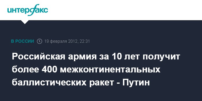 Москва. 19 февраля. ИНТЕРФАКС - Премьер-министр РФ Владимир Путин заявляет о планах поставок в войска новых типов вооружений, сообщает "Российская газета".