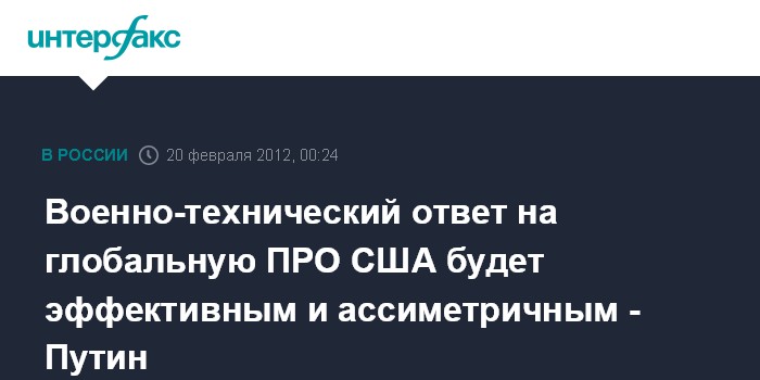 "Военно-технический ответ России на глобальную американскую ПРО и ее сегмент в Европе будет эффективным и ассиметричным. И будет полностью соответствовать шагам США в сфере ПРО", - заявил премьер.
