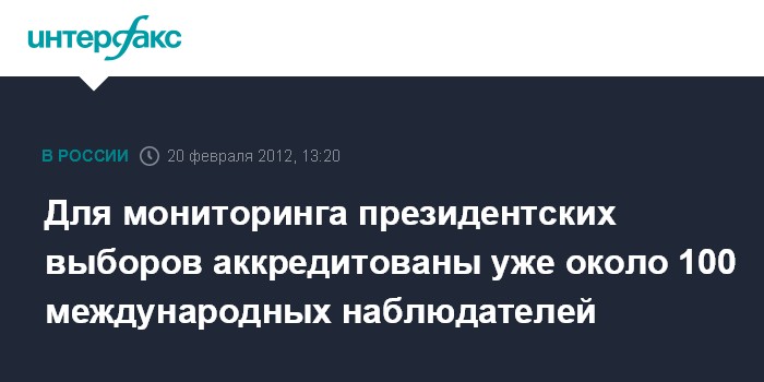 Москва. 20 февраля. INTERFAX.RU - Глава Центризбиркома РФ Владимир Чуров сообщил, что на данный момент для мониторинга президентских выборов в России аккредитовано 90 долгосрочных и шесть краткосрочных международных наблюдателей.