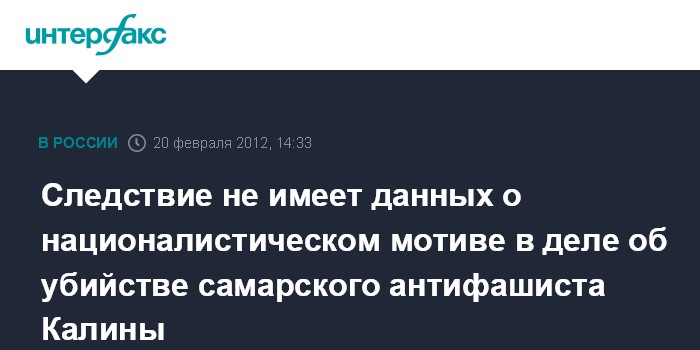 Самара. 20 февраля. INTERFAX.RU - СУ СКР по Самарской области расследует убийство местного активиста Никиты Калины, сообщила агентству "Интерфакс-Поволжье" пресс-секретарь ведомства Елена Шкаева.