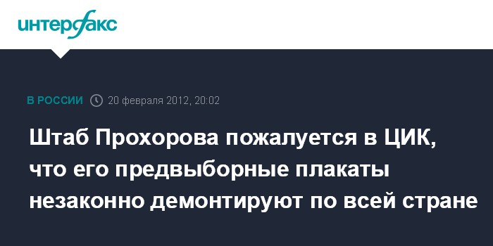 Москва. 20 февраля. INTERFAX.RU - Представители кандидата президента РФ Михаила Прохорова намерены обратиться в ЦИК России в связи с незаконным, на их взгляд, демонтажем предвыборных плакатов М.Прохорова в ряде городов страны.