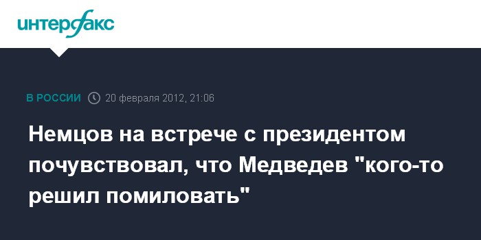 Москва. 20 февраля. INTERFAX.RU - Сопредседатель движения "Солидарность" Борис Немцов в целом удовлетворен встречей с президентом РФ Дмитрием Медведевым и не исключает, что после нее глава государства помилует некоторых политзаключенных. "Я передал ему список из 37 политзаключенных, при этом озвучив некоторые фамилии, в том числе Михаила Ходорковского и Платона Лебедева, предложив их помиловать. Конечно, однозначно утверждать не могу, но, судя по реакции Медведева, у меня появилось ощущение, что кого-то он решил помиловать", - рассказал Немцов "Интерфаксу".