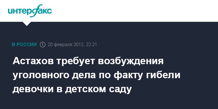 Москва. 20 февраля. INTERFAX.RU - Уполномоченный по правам ребенка при президенте РФ Павел Астахов требует возбудить уголовное дело в связи с гибелью трехлетней девочки в московском детском саду. "Должно быть незамедлительно возбуждено уголовное дело в связи с гибелью девочки. Всем детсадам необходимо усилить меры безопасности", - написал Астахов в своем блоге в "Твиттере" в понедельник. "Главная задача воспитателей - постоянно видеть каждого ребенка и предупреждать любые неожиданности: защищать, охранять и беречь", - отметил Астахов.