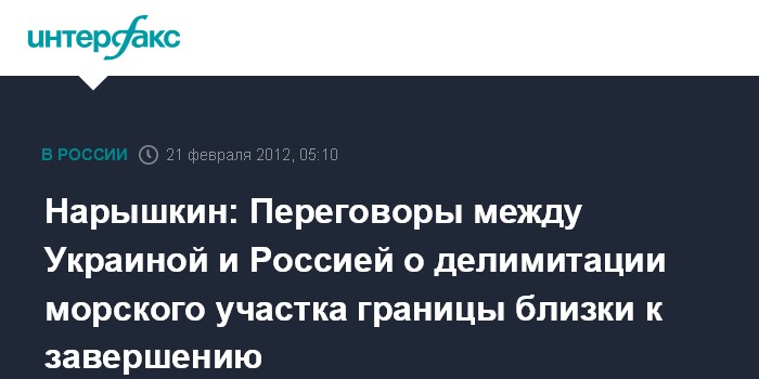 Киев. 21 февраля. ИНТЕРФАКС-УКРАИНА - Переговоры между Киевом и Москвой о делимитации морского участка границы и Керченского пролива близки к завершению, заявляет спикер Госдумы Сергей Нарышкин, который находится на Украине с рабочим визитом.