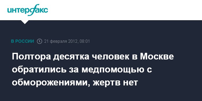 Москва. 21 февраля. ИНТЕРФАКС – Полтора десятка человек за последние сутки обратились к медикам за помощью с травмами, вызванными морозами, сообщил "Интерфаксу" источник в медицинских кругах Москвы.