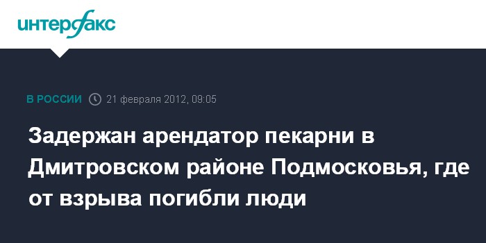 Москва. 21 февраля. INTERFAX.RU - Арендатор помещения пекарни в подмосковных Горках-25, где поздно вечером в воскресенье произошли взрыв и пожар, приведшие к гибели двух человек, задержан, сообщил "Интерфаксу" официальный представитель ГУ МВД по Московской области Евгений Гильдеев.