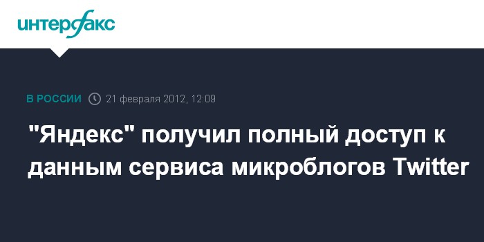 Москва. 21 февраля. INTERFAX.RU - Интернет-поисковик "Яндекс" получил полный доступ к данным (firehose) сервиса микроблогов Twitter, что позволяет пользователям поисковой системы находить твиты уже через несколько мгновений после их появления, говорится в сообщении "Яндекса".