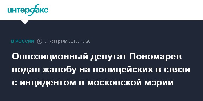Москва. 21 февраля. INTERFAX.RU - Депутат-"справедливоросс" Илья Пономарев подал заявление в полицию в связи с инцидентом, произошедшим в московской мэрии в понедельник утром