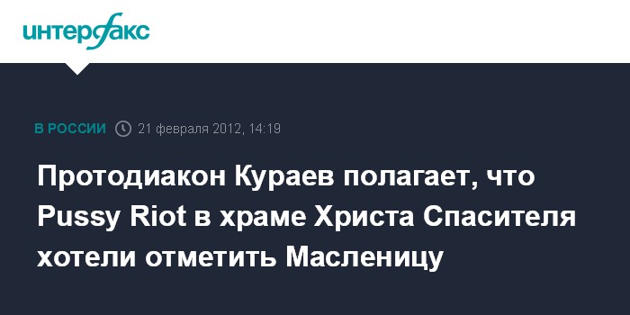 Москва. 21 февраля. INTERFAX.RU - Профессор Московской духовной академии протодиакон Андрей Кураев предположил, что феминистская панк-группа "Pussy Riot", проведя акцию в храме Христа Спасителя в Москве, таким образом хотела отметить Масленицу.