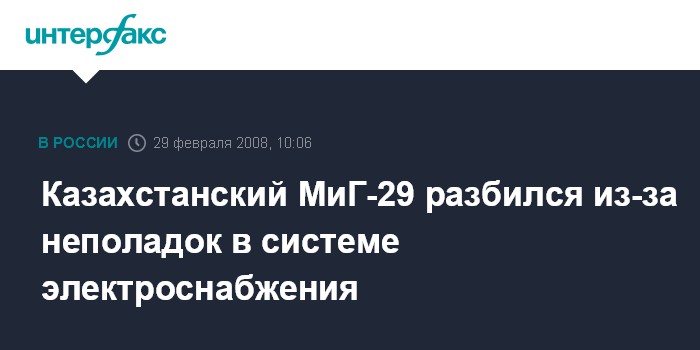 Алма-Ата. 29 февраля. INTERFAX.RU - Причиной катастрофы МиГ-29 УБ сил воздушной обороны вооруженных сил (СВО ВС) Казахстана 12 февраля на аэродроме "Жетыген" в Алматинской области (на юго-востоке) стали неполадки в системе электроснабжения самолета.