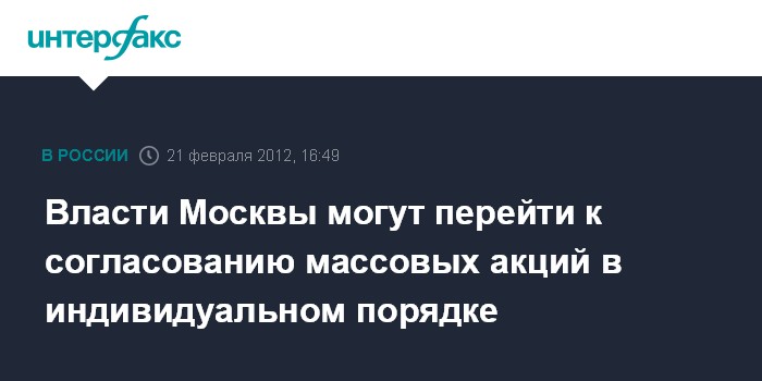 Москва. 21 февраля. INTERFAX.RU - Мэрия Москвы, возможно, откажется от принципа, согласно которому согласование массовых акций зависит от времени подачи заявки теми или иными организаторами, заявил "Интерфаксу" источник, знакомый с ситуацией. "Временной приоритет, когда согласование получает тот, кто первым подал заявку, возможно, будет отменен", - сказал источник.