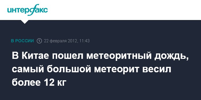Пекин. 22 февраля. INTERFAX.RU - Метеоритный дождь прошел в западной китайской провинции Цинхай, вес самого большого найденного на месте падения метеорита составил 12,5 килограммов, сообщили в среду китайские СМИ.