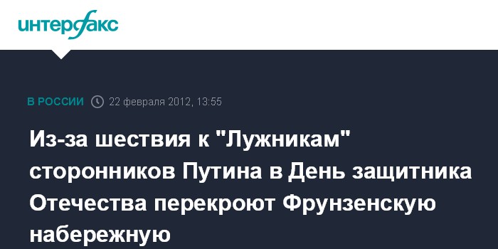 Из-за шествия к "Лужникам" сторонников Путина в День защитника Отечества перекроют Фрунзенскую набережную