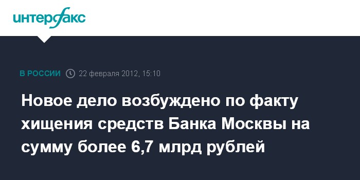 Новое дело возбуждено по факту хищения средств Банка Москвы на сумму более 6,7 млрд рублей