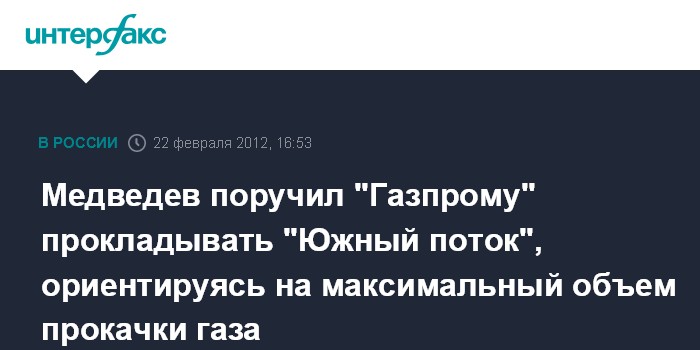 "Мы должны определиться, какова должна быть окончательная мощность "Южного потока". Вы ориентируетесь на то, что происходило в начале этого года. Происходило ровно то, что происходило в предыдущий год, и это является для меня достаточным основанием поручить "Газпрому" при проектировке и прокладке газопровода "Южный поток" ориентироваться на максимальный объем прокачки газа", - сказал Медведев на встрече с главой "Газпрома" Алексеем Миллером.