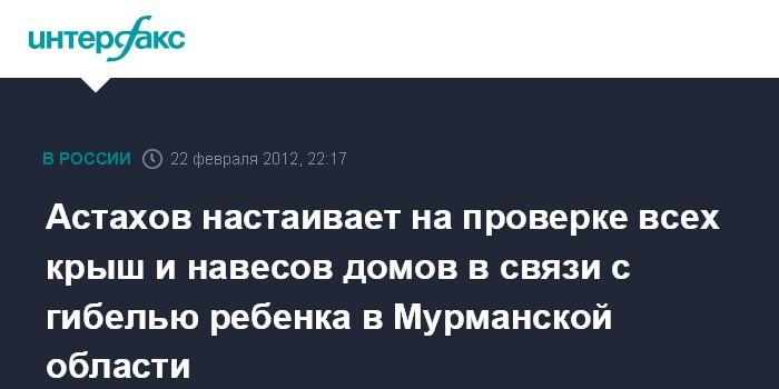 Москва. 22 февраля. INTERFAX.RU - Уполномоченный при президенте РФ по правам ребенка Павел Астахов заявил, что необходимо провести срочную проверку исправности навесов жилых домов и детских учреждений после гибели ребенка в Мурманской области от обвалившегося под тяжестью снега козырька подъезда.
