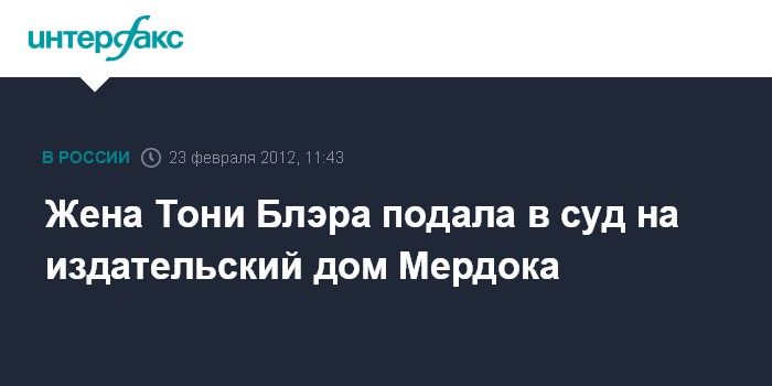 Лондон. 23 февраля. INTERFAX.RU - Шери Блэр, жена бывшего британского премьера Тони Блэра, подала судебный иск против издательского дома "Ньюс Интэрнешнл", являющегося частью корпорации медиамагната Руперта Мердока, сообщает в четверг британская телерадиокорпорация Би-би-си. Как заявил адвокат истицы Грэм Аткинс, иск был подан еще во вторник и связан с делом о прослушивании журналистами издательского дома телефонных разговоров знаменитостей, в том числе, и его подзащитной.
