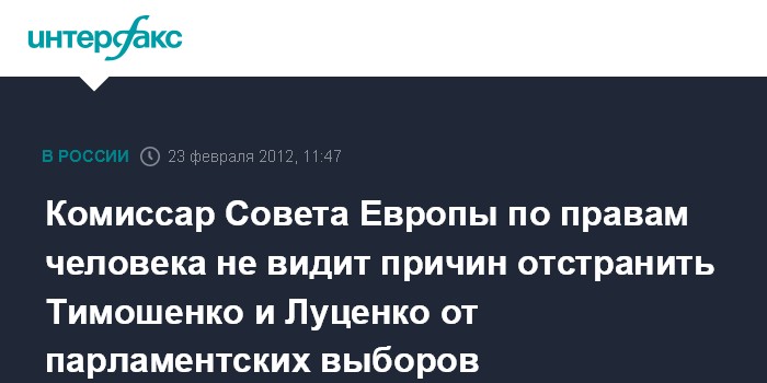 Киев. 23 февраля. INTERFAX.RU - Комиссар Совета Европы по правам человека Томас Хаммарберг считает, что на сегодняшний день нет причин не допускать к участию в парламентских выборах осужденную экс-премьера Украины Юлию Тимошенко и находящегося под арестом экс-главу МВД Юрия Луценко. "Прежде всего, для меня важно, что с человеком поступили некорректно, нарушив демократические стандарты, и кто бы ни был на месте Ю.Тимошенко, я бы занял такую же позицию", - сказал Т.Хаммарберг в интервью изданию "Коммерсант-Украина", опубликованном в четверг.