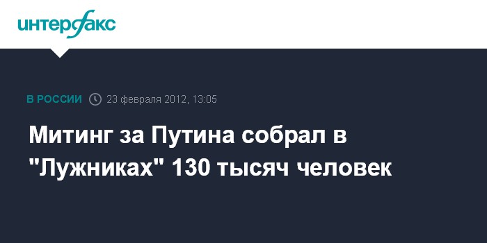 Москва. 23 февраля. INTERFAX.RU - Около 130 тысяч человек собрались в "Лужниках" на митинг в поддержку кандидата в президенты РФ Владимира Путина, сообщили "Интерфаксу" в пресс-службе ГУ МВД России по Москве. "На территории олимпийского комплекса "Лужники" для участия в митинге собралось около 130 тысяч человек", - сказали в пресс-службе. Около 30 тысяч участников митинга пришли на территорию "Лужников" к Большой спортивной арене (БСА), где проходит мероприятие, в составе шествия, стартовавшего ранее на Фрунзенской набережной.