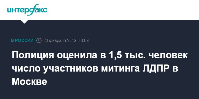 Москва. 23 февраля. INTERFAX.RU - Около полутора тысяч участников собрал в четверг митинг ЛДПР на Пушкинской площади, сообщили "Интерфаксу" в пресс-службе ГУ МВД России по Москве. "На Пушкинской площади, где в 12 часов начался митинг в поддержку кандидата в президенты Владимира Жириновского, организованном ЛДПР, собралось около 1,5 тысяч человек", - сказали в пресс-службе. Там добавили, что это данные по состоянию на 13.00.