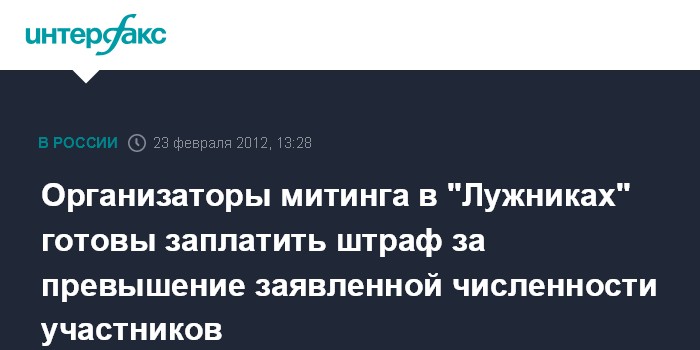 Москва. 23 февраля. INTERFAX.RU - Организаторы митинга в поддержку кандидата в президенты Владимира Путина не будут отказываться от выплаты штрафа за превышение численности участников, если такое решение вынесет суд, заявил "Интерфаксу" заместитель главы предвыборного штаба В.Путина Алексей Анисимов. "Вопрос о штрафе - это не к нам, это к правоохранительным органам. Однако если суд вынесет соответствующее решение, то не исполнять его мы не имеем права", - отметил он.