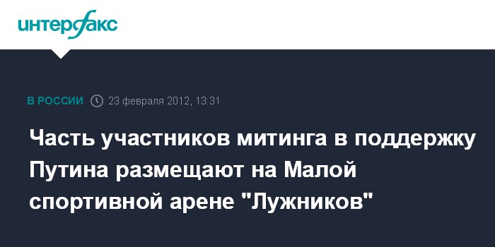 Москва. 23 февраля. INTERFAX.RU - Часть людей, прибывших на митинг "Защитим Россию" в "Лужники", размещается на Малой спортивной арене, сообщили "Интерфаксу" организаторы мероприятия. Они пояснили, что это связано с большим количеством желающих принять участие в митинге.