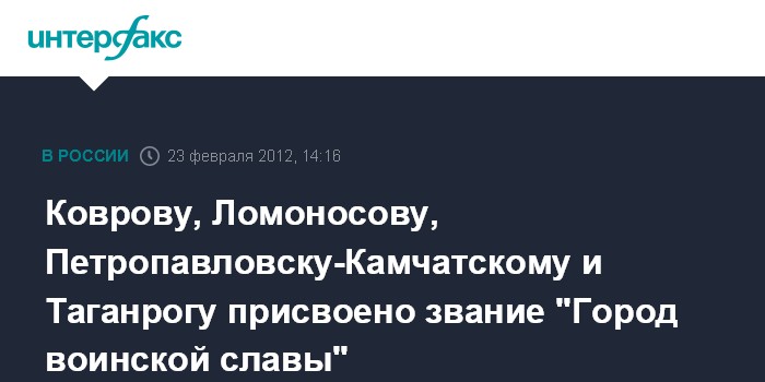 Коврову, Ломоносову, Петропавловску-Камчатскому и Таганрогу присвоено звание "Город воинской славы"