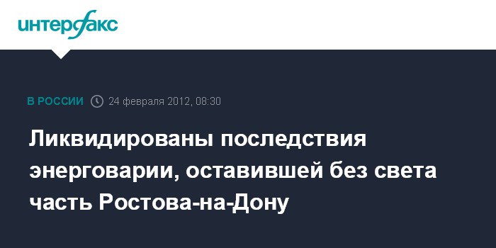 Ростов-на-Дону. 24 февраля. INTERFX.RU - Аварийные бригады энергетиков в короткие сроки устранили неполадки на одном из участков электросетей в Ростове-на-Дону, сообщили в пятницу агентству "Интерфакс-Юг" в пресс-службе "Ростовэнерго".