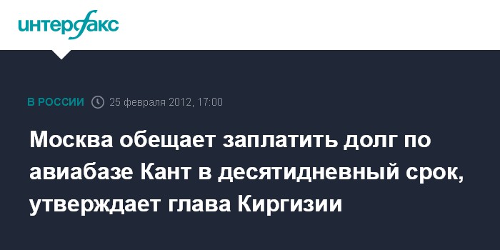 Москва. 25 февраля. INTERFAX.RU - Президент Киргизии Алмазбек Атамбаев заявил, что Россия задолжала за использование военной базе в Канте, но долг будет погашен в течение 10 дней.