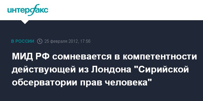 Москва. 25 февраля. INTERFAX.RU - В Москве подвергают сомнению достоверность информации, которую распространяет работающая из Лондона "Сирийская обсерватория прав человека". "Мы обратили внимание на то, что ряд иностранных информагентств, прежде всего западных, в своих репортажах о Сирии нередко ссылаются на информацию, полученную из т.н. "Сирийской обсерватории прав человека" в Лондоне", - заявил в субботу, отвечая на вопрос журналистов, официальный представитель МИД РФ Александр Лукашевич.