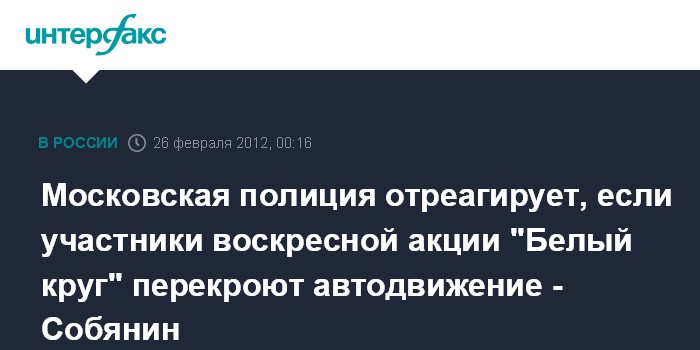 Москва. 26 февраля. ИНТЕРФАКС - Мэр Москвы Сергей Собянин предупредил, что правоохранительные органы не позволят участникам намеченной на воскресенье акции "Большой белый круг" блокировать дороги.